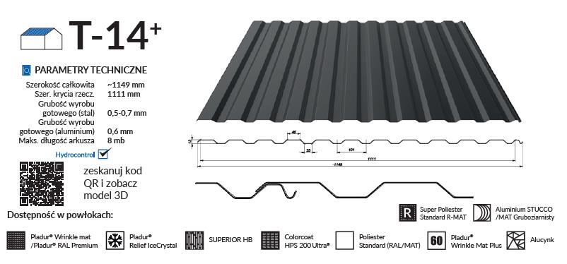 Samonośne blachy trapezowe T-14 plus, dostarczane w formie gotowych elementów, stosowane do pokryć dachowych o pochyleniu nie mniejszym niż 9°. W przypadku materiału Colorcoat HPS200 Ultra® minimalne nachylenie dachu wynosi 6°. Blachy te używane są jako elementy wykończeniowe i zabezpieczające w budynkach. Blachy trapezowe należy stosować zgodnie z: projektami technicznymi budynków, instrukcjami i zaleceniami montażowymi producenta, obowiązującymi normami i przepisami technicznobudowlanymi. Na łączeniach arkuszy i przy okapie należy usunąć barierę antykondensacyjną przez wycięcie, aby woda i wilgoć z zewnątrz nie była wchłaniana do warstwy materiału. Przy profilowaniu blach trapezowych (zwłaszcza z flizeliną) ze względów technicznych i technologicznych może wystąpić poprzeczne wygięcie blach w kształcie U. W takim przypadku konieczne jest zastosowanie przy ich montażu na zakładzie podłużnym dodatkowych wkrętów o długości 19 mm (blacha z blachą). Jest to zjawisko naturalne i niezależne od Producenta. Blachotrapez zaleca, aby Kupujący nabył wszystkie potrzebne materiały do realizacji jednej inwestycji w ramach jednego zamówienia. W przypadku domówienia, mogą wystąpić różne odcienie i struktura co jest niezależne od Producenta. Stosowany materiał wsadowy ma szeroki zakres zastosowania ze względu na klasyfikację środowiskową, co między innymi potwierdzamy długim okresem gwarancyjnym w zależności od materiału (patrz oddzielny druk gwarancyjny zamieszczony również na naszej stronie www.blachotrapez.eu).