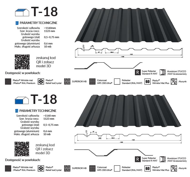 Samonośne blachy trapezowe T-18/ T-18 plus, dostarczane w formie gotowych elementów, stosowane do okładzin ściennych, oraz do pokryć dachowycho pochyleniu nie mniejszym niż 9°. W przypadku materiału Colorcoat HPS200 Ultra® minimalne nachylenie dachu wynosi 6°. Blachy te używane są jako elementy wykończeniowe i zabezpieczające w budynkach. Blachy trapezowe należy stosować zgodnie z: projektami technicznymi budynków, instrukcjami i zaleceniami montażowymi producenta, obowiązującymi normami i przepisami techniczno- budowlanymi.